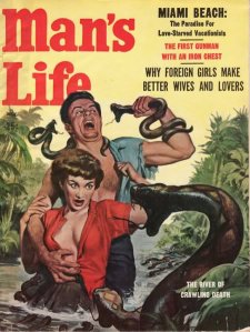 Many of these magazines feature scantily-clad young women being tortured by Nazis or Communists or attacked by large snakes. I’m not sure what this snake motif is about, but I suspect Freud might have an idea.
