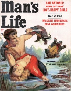The cover at left illustrates the story “Trapped in a Sea of Giant Crabs,” while the one at right features “Chewed to Death by Giant Turtles.” As you can see, “Man’s Life” had a thing about rugged shirtless men — who all appear to be the same guy — being attacked by man-eating rats or “Eaten Alive by Killer Pigs.” That’s one unlucky dude. It’s hard to imagine anyone reading this stuff with a straight face, but what do I know?
