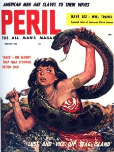 Many of these magazines feature scantily-clad young women being tortured by Nazis or Communists or attacked by large snakes. I’m not sure what this snake motif is about, but I suspect Freud might have an idea.