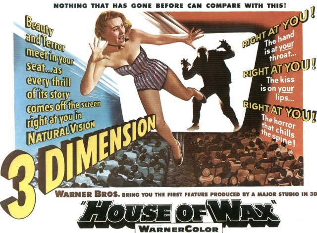 The 3D craze exploded in ’53. One of the most effective uses of the process was House of Wax, which is ironic when you consider that the director, Andre De Toth, had only one eye. The poster below gives you some idea of the subtlety of the film’s marketing.