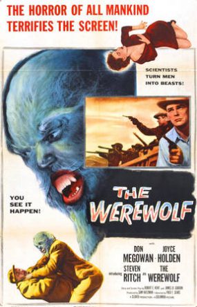 These two films were directed by the same man, Fred F. Sears, but they couldn’t be more different. Earth vs. the Flying Saucers has excellent stop-motion work by the justly-revered Ray Harryhausen, and it’s always fun seeing landmarks in Washington D.C. being destroyed, but otherwise it’s not very good. I think I knew that even then. The Werewolf has the distinction of scaring me so much I had to leave the theater before it was over. It might be that there was something a little too real about it. Werewolves are traditionally supernatural creatures governed by specific genre rules (full moon, wolfsbane, “Even a man who is pure in heart…”, yadda yadda) but this was wasn’t that at all. In it, a stranger from a car accident is injected with an experimental drug containing irradiated wolf’s blood by two scientists trying to find a cure for radiation poisoning. This has the result of transforming this poor guy into a werewolf. Of course it does. Not much real about that, I know. So what was it? The film is set in a small town near the mountains somewhere in the Northwest during the winter. There’s a scene that takes place in the alley outside a seedy bar where the protagonist in werewolf form, though we don’t see him, is attacking a man. All we see are their legs and feet thrashing about, and sounds of struggle, groaning, growling. I found this really upsetting. Maybe it was too easy for me to imagine that anybody could be attacked like this, though probably not by a werewolf. I think the film, up to the point where I left, was too close to the everyday. And with one exception, I didn’t know anyone in this film. It was like they weren’t actors. Whatever was going on with me, I left shortly after this scene. I finally saw The Werewolf on television a couple of years ago. It’s no masterpiece, but there’s still something uncomfortable about it.