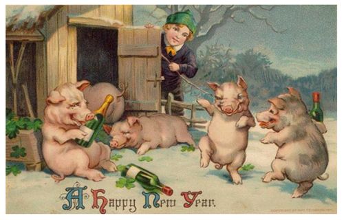 While looking for images to include in this post, I ran across the following. They may not all be literally New Year’s greetings, but I like them. Particularly this one depicting a fresh-faced young lad observing a bunch of drunken pigs celebrate the new year. I’m just trusting my gut here.