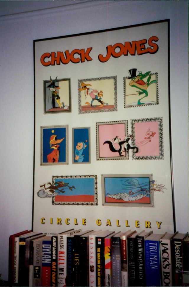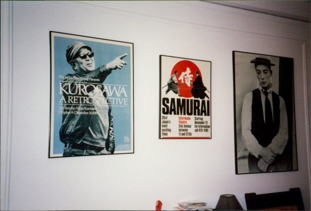 Before my wife-to-be moved in with me in 2004, my apartment was basically a movie poster gallery and library. It turned out Nancy thought we should have some actual furniture for grown ups, such as a sofa and maybe some lamps, and stuff other than film posters on all the walls. Here’s what the living room was like before. This shot was taken in the ’90s before I’d had the old rug taken up and the wood floor refinished.