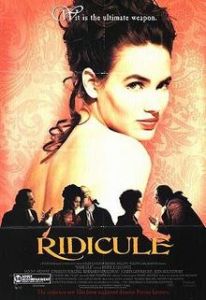 12/7. RIDICULE at Lincoln Plaza. Directed by Patrice Laconte (MONSIEUR HIRE). Cast: Charles Berling (Ponceludon de Malavoy), Judith Godreche (Mathilde de Bellegarde), Jean Rochefort (Marquis de Bellegarde), Fanny Ardant (Madame de Blayac), Bernard Giraudeau (Abbot de Vilecourt). * I really liked this one. About life at the court of Versailles a few years before the Revolution, and how important it was to one’s survival there to possess a quick and cutting wit. The story’s about Ponceludon’s efforts to get a grant from the king to drain the swamps to save lives from mosquitos and malaria, and how he’s willing to ingratiate himself at Versailles to do this. He’s a really sharp witted guy, and Jean Rochefort takes him under his wing, plus he falls in love with Rochefort’s beautiful, willful daughter Mathilde, who spends much of her time trying to perfect a diving suit. This stuff with the diving suit is really unexpected and quite wonderful. This movie was a real pleasure to sit through. Odd thing at the beginning, before the main title credits we see this guy go into the dark room of an enfeebled aristocrat, who we learn was renowned for his cutting wit at court, piss on this old man for a remark made years before that humiliated this guy. What I found curious is that we get a close shot of the man undoing his trousers and pulling out his cock, which I suppose was a prosthetic and not his real dick, then shots from an angle showing the stream of piss. I’m wondering why they showed the cock, when the action could have been clearly conveyed without doing so. Maybe it was supposed to provide a real jolt at that point, and really break the decorum of the language being spoken, etc. Whatever. Great movie. Would like to find out if it’s based on actual characters and events.